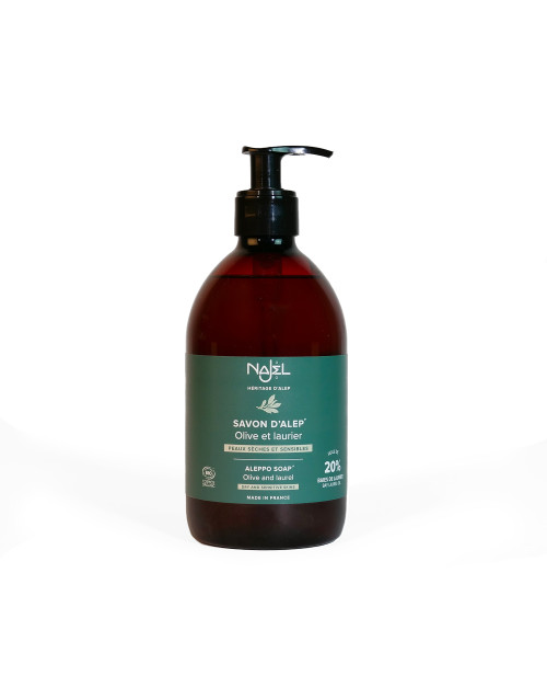 Discover genuine Aleppo Soap in liquid form. It is made from olive oil and bay laurel oil, ingredients of the genuine hard Aleppo Soap, so you will find all the same virtues as true Aleppo Soap.