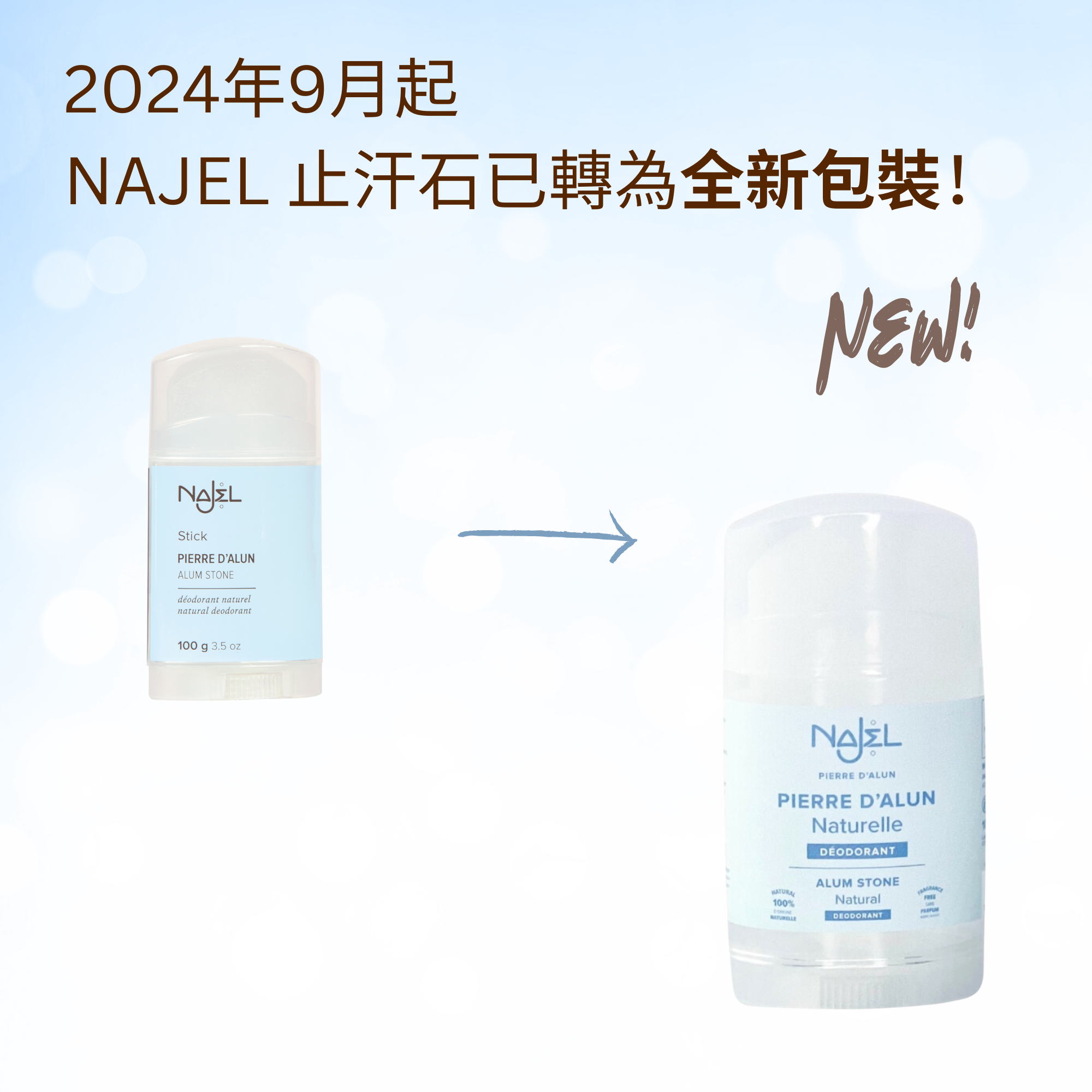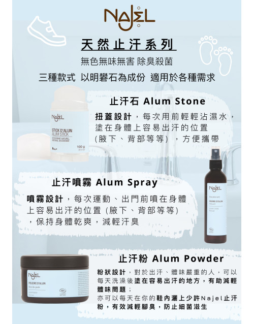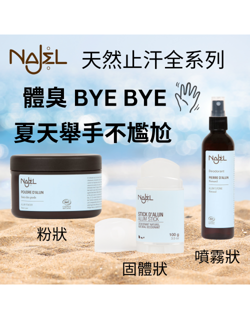 NAJEL 天然止汗系列不含任何化學物質、香料,比市面的化學止汗劑對你的皮膚更健康,不會堵塞你的毛孔!