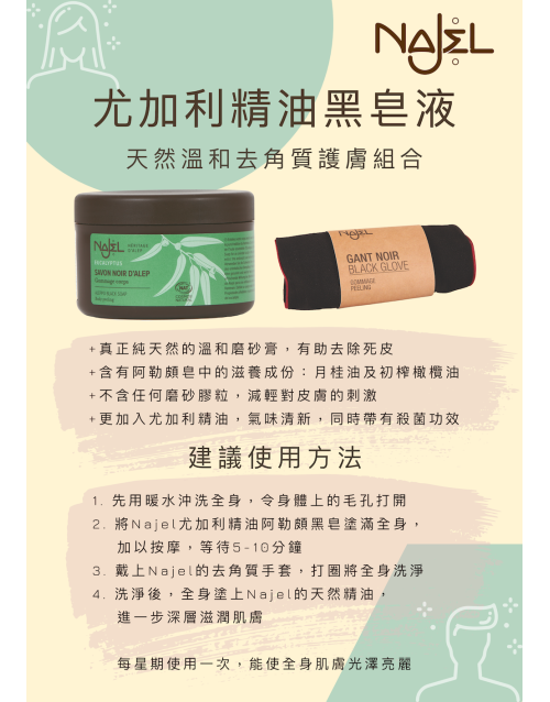 !NAJEL 去角質手套 (Kessa Glove) 是使用 Najel 尤加利精油黑皂液去身體角質不可缺少的配件!用法先將 NAJEL 黑皂液塗滿全身,靜待數分鐘後,將 NAJEL 去角質手套帶上,..