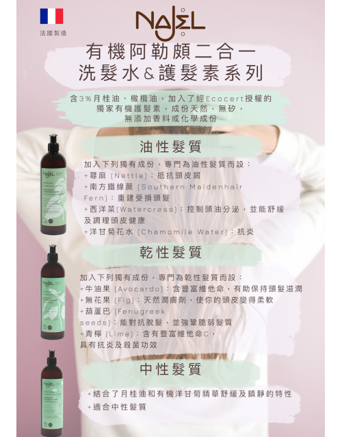 !NAJEL 品牌最新改良的護髮配方!蘊含 3% 月桂油、有機洋甘菊精華,帶有舒緩及鎮靜的特性能夠深層清潔頭皮,改善髮質健康,減輕脫髮加入了經Ecocert授權的獨有護髮素,用後充..