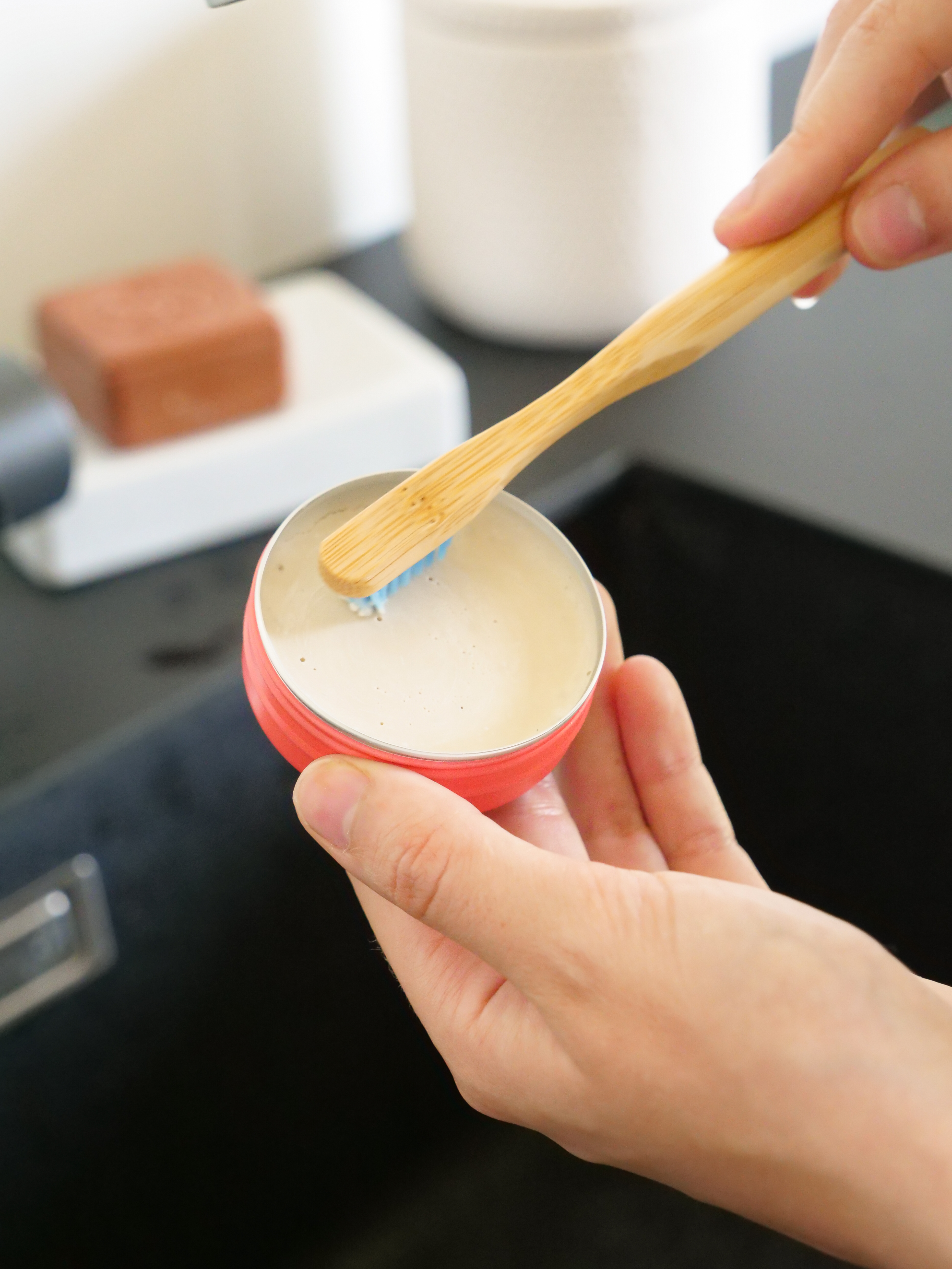 1. 先沾濕牙刷,以牙刷輕擦牙膏表面 (大約打2圈)